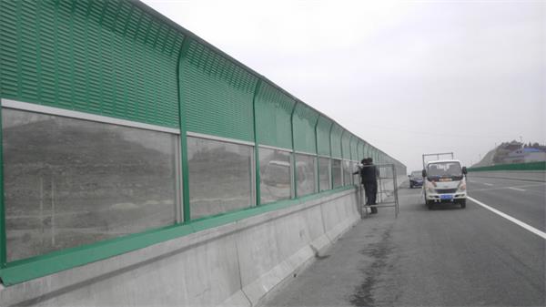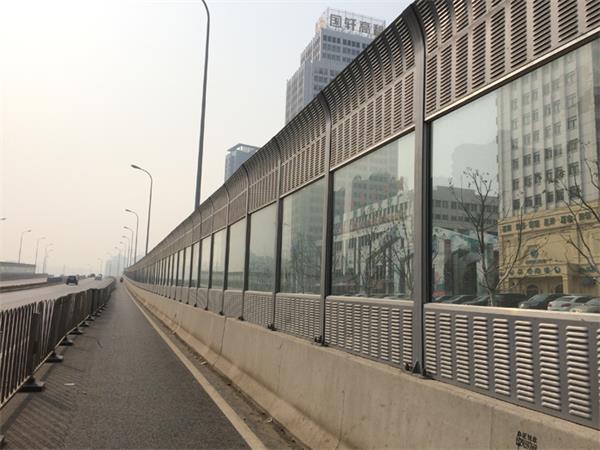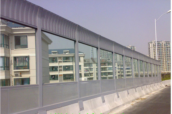 高架橋聲屏障目前常用的是吸聲和隔聲混合型聲屏障,高架橋聲屏障由上下部分金屬百葉吸聲屏、中部透明隔聲共三屏組成,整個屏障呈弧形。